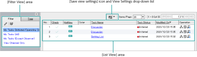 | Filter List | Lists the filters for narrowing the range of tasks. Click a filter name to display the tasks narrowed down by the filter in the [List View] area. The selected filter is highlighted with darker background color. |