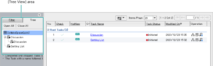 | Tree view of Tasks | Tasks having other Tasks under them have a "+" sign attached. When the "+" sign is clicked, all the Tasks below that Task are unfolded and the "+" sign changes to "-". When the "-" sign is clicked, all the unfolded Tasks are folded. When the CollaboSpace server's host name or task name is selected, the CollaboSpace server's route task list or the selected task together with its child task list is displayed in the [List View] area. The selected filter is highlighted with darker background color. |