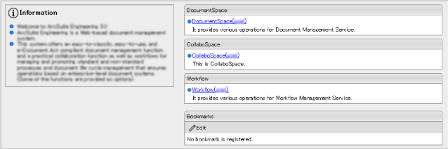 | [Bookmarks] area | Displays the link list of URLs registered as bookmarks by the login user. To register or edit "bookmarks", click the [Edit] button.