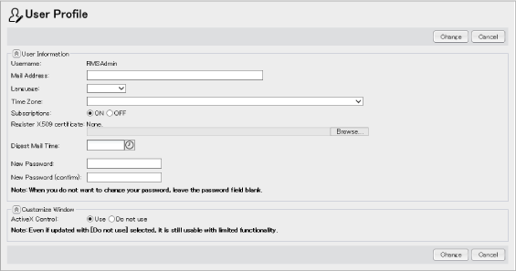 Viewing or changing [Mail Address], [Language], [Time Zone], [Subscriptions], [X.509 Certificate], and [Digest Mail Delivery] may not be allowed depending on the settings of the Portal Administrative Application.